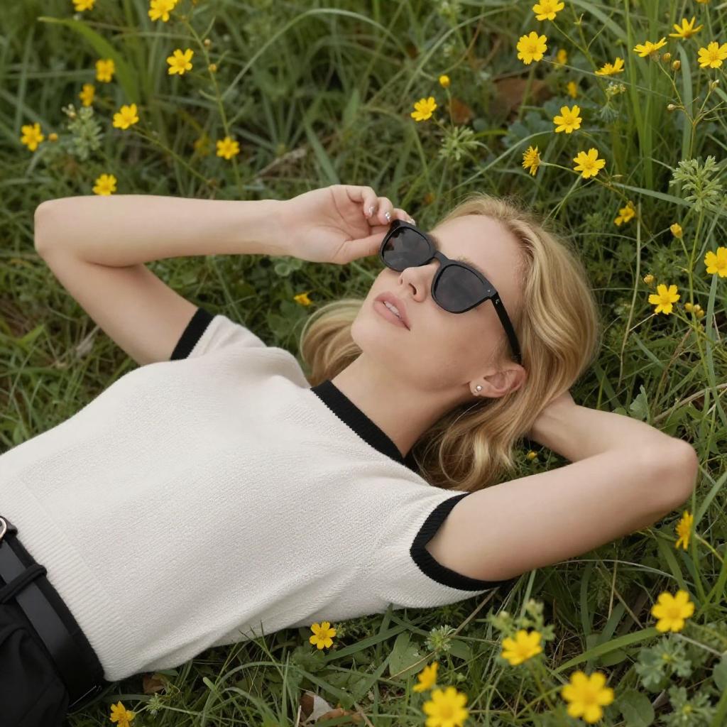 Photograph of a blonde woman with fair skin lying in a field of small yellow flowers. She wears a white, short-sleeved, knit top with black sleeves, and black sunglasses. Her right hand adjusts the sunglasses, and her left arm rests beside her head. The background is lush with green foliage and scattered yellow flowers.