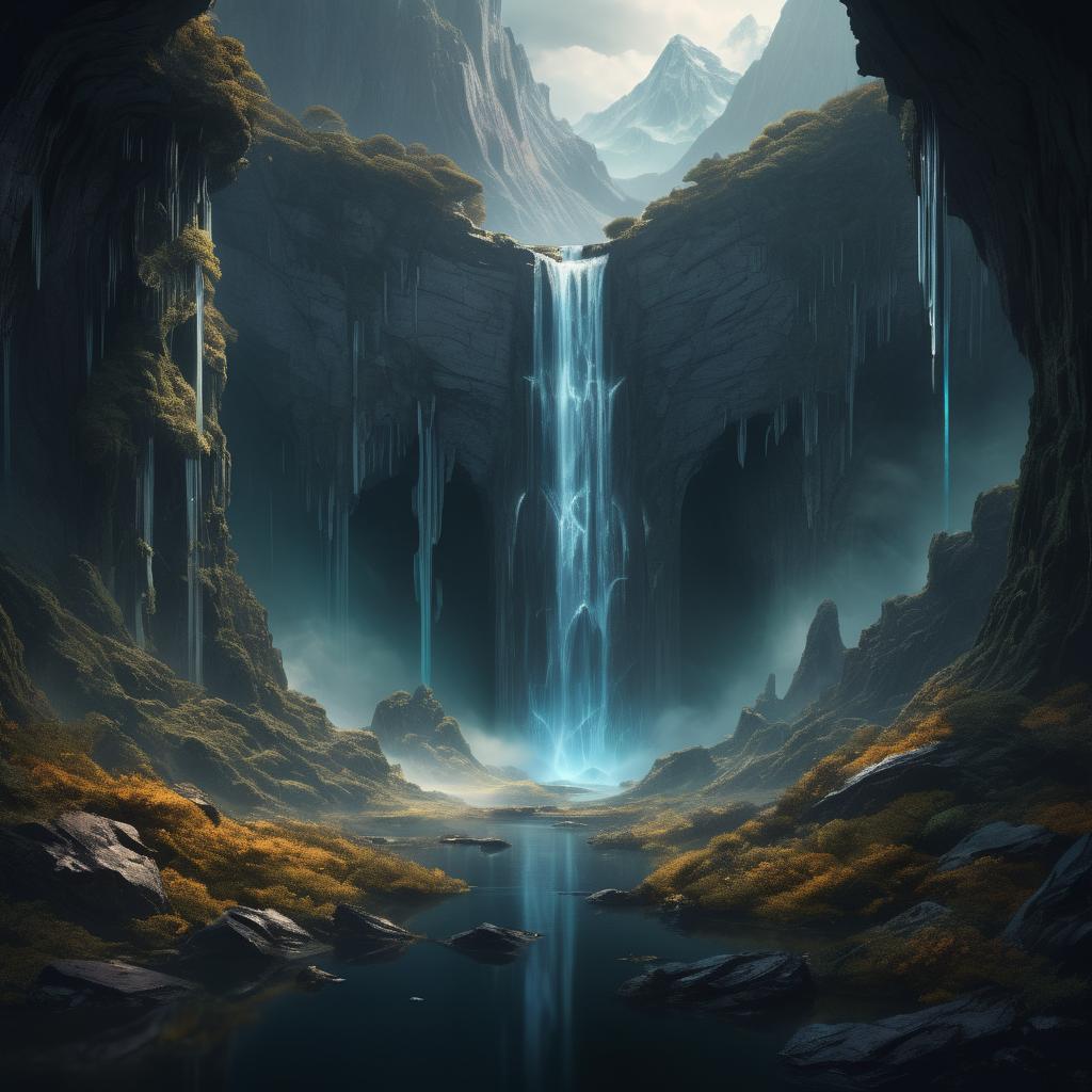 Envisioning the vastness of the cosmos, a mystical dreamscape of transient waterfalls where wonders of land peaks roam among shadowy depths. Bathed in ethereal glows, this scene is rich in intricate details, evoking a sense of wonder and cinematic beauty.