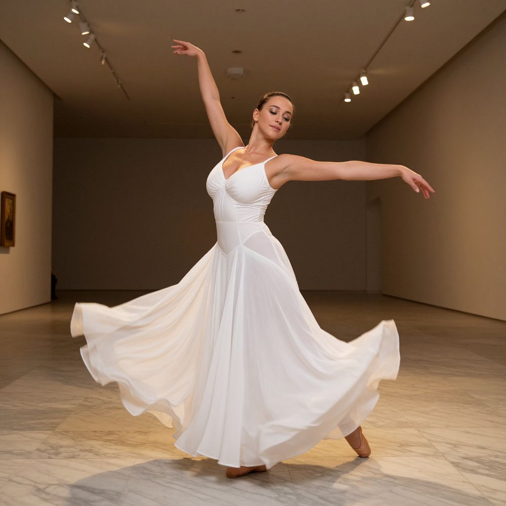 Photograph of a dancer in a flowing white dress, mid-pose in a minimalistic gallery with marble floors and spotlights.