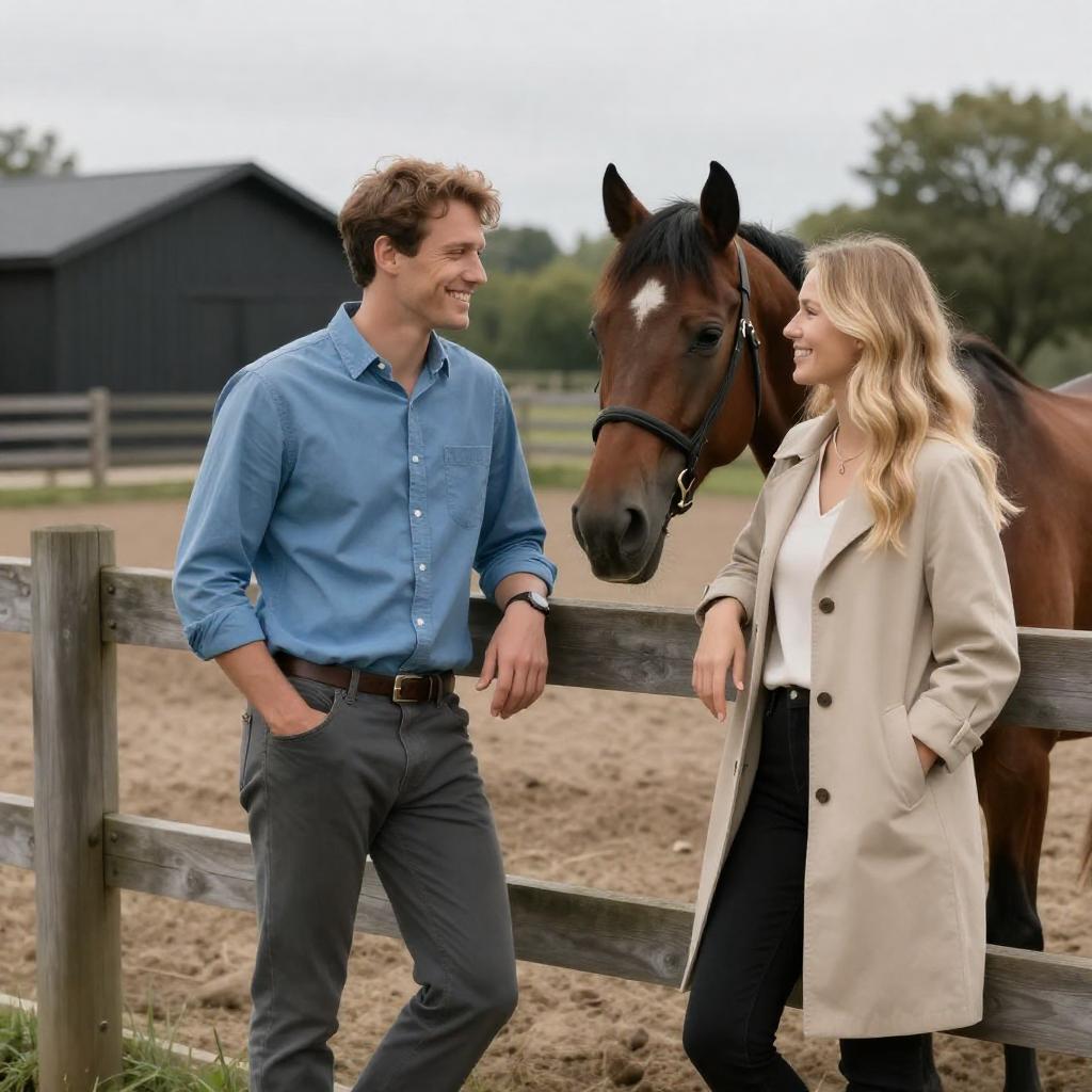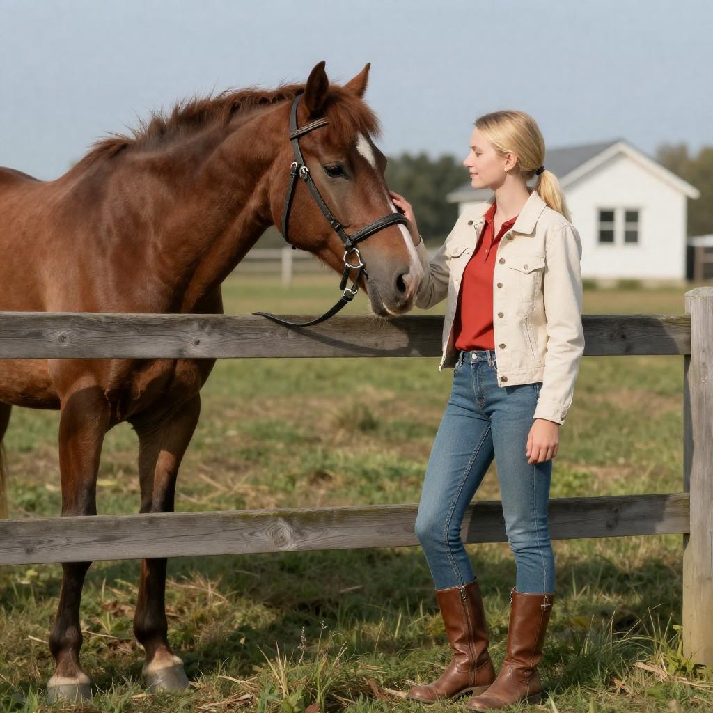 Blonde girl with light jacket, red shirt, blue jeans, and brown boots stands against wooden fence, touching brown horse's head. Horse has brown coat, black bridle. Grass field, small white house in background. Bright daylight.