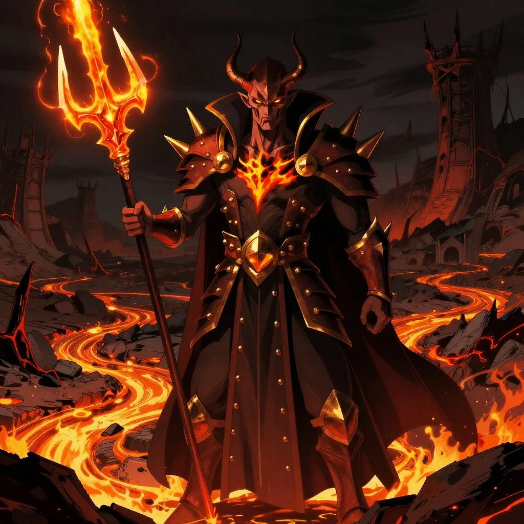 A nightmarish demon overlord, wearing armored robes studded with infernal spikes, wielding a massive flaming trident, in a blasted wasteland with rivers of molten lava, drawn in the dark and stylish anime style of Kouta Hirano.