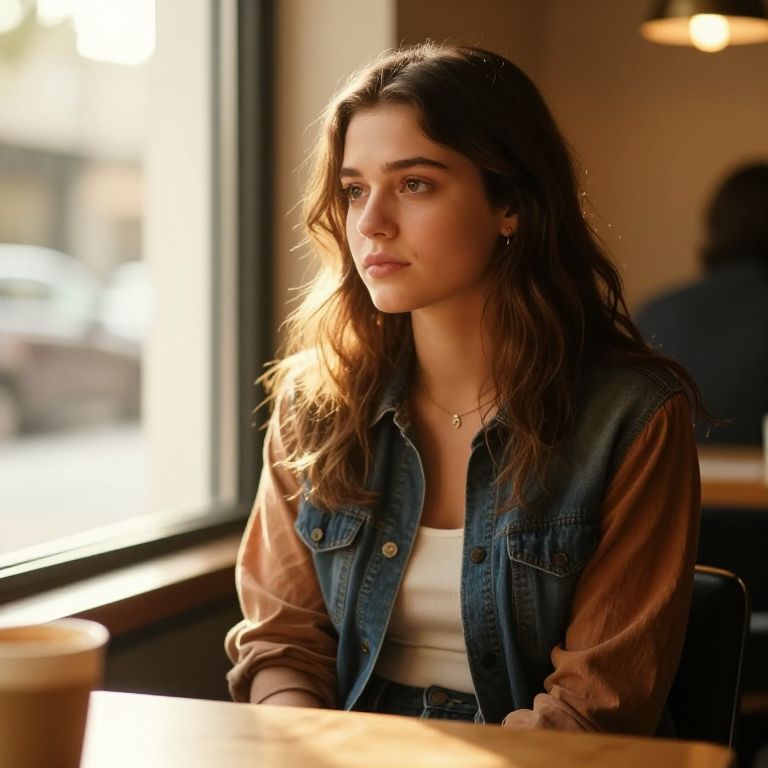 Photograph of a young woman with light olive skin and long, straight brown hair, shown in profile facing left. She has a small nose, full lips, and brown eyes. She is wearing a strapless top, revealing her bare shoulders. The background is a blurred, lush green foliage, suggesting an outdoor setting. The lighting is natural, highlighting her soft features and creating a serene, contemplative mood. The image focuses on her upper body and face, capturing a moment of quiet reflection.