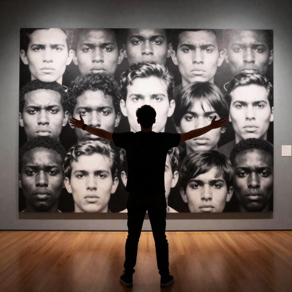 Silhouette of a person with outstretched arms standing in front of a large black-and-white mural of numerous faces, intense expressions, crowded arrangement, wooden floor, grey walls, high contrast lighting.
