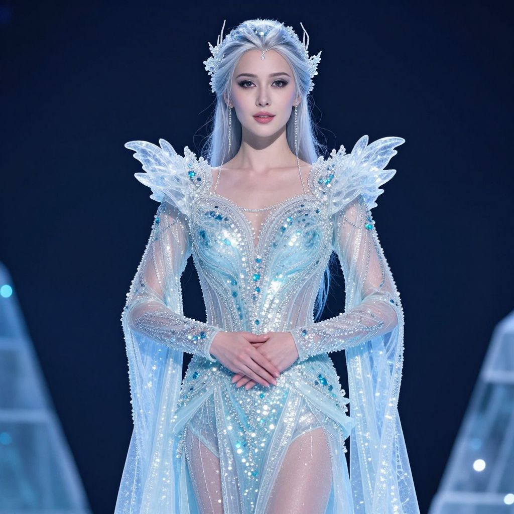 A woman dressed in a stunning, icy, haute couture outfit with glittery details, resembling the ice goddess, stands confidently with her hands clasped in front of her.
