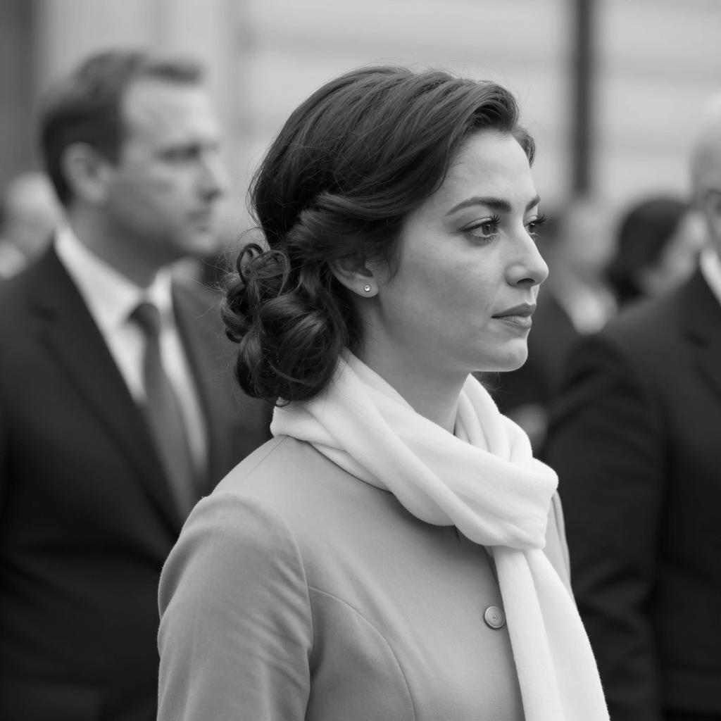 Black-and-white photograph of five people. Four adults and one child. Man on left in suit, focused on hands. Woman in center with medium-length hair, serious expression. Man on right with child, holding child from behind. Child in foreground with short hair, looking down. Background crowd, blurred. Casual clothing, coats. Emotional expressions.