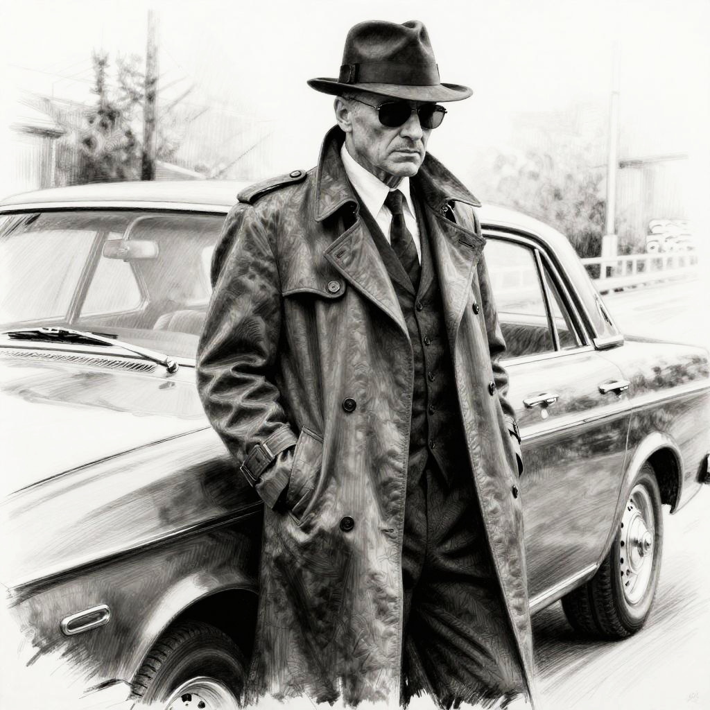 Mafia boss drawing, stylized charcoal drawing of an old-school mafia boss with a fedora and trench coat, standing beside a classic car, moody black and white tones