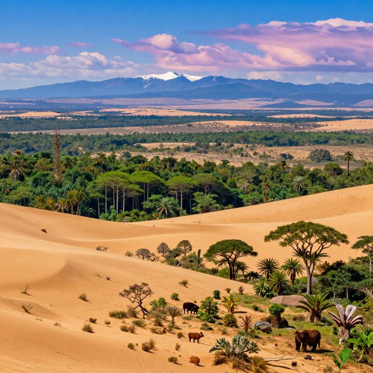 Photograph of a vibrant savanna landscape, showcasing golden sandy dunes in the foreground with scattered acacia trees and a few grazing antelopes. Mid-ground features a dense, green forest. In the background, a range of snow-capped mountains under a bright blue sky with fluffy, pink-tinged clouds. The vivid colors and contrasting textures of sand, trees, and mountains create a striking, natural panorama. The scene captures the essence of a sunny, African savanna with its unique flora and fauna.