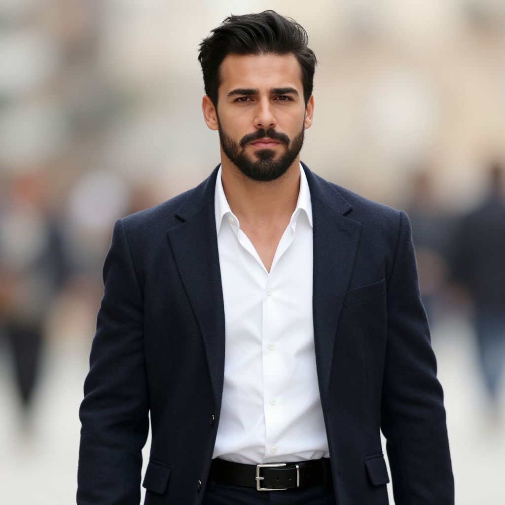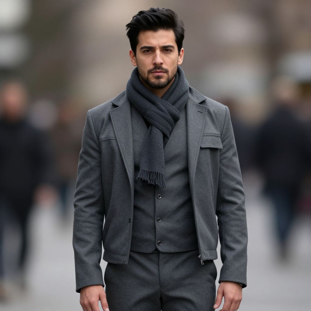 Grey pants male costume, 1boy, male focus, solo, realistic, looking at viewer, black hair, facial hair, scarf, blurry background, blurry, portrait, jacket, closed mouth