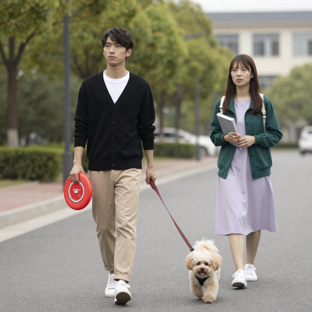 Man in black cardigan and beige pants holding red frisbee, walking small fluffy dog on leash. Woman in green jacket and lavender dress holding book, standing on road. Green trees, street lamp, and building in background. Both looking forward.