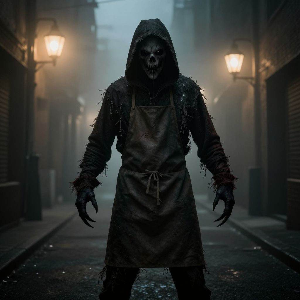 The hash slinging slasher costume, featuring a spooky apron and ragged clothes, standing in a fog-filled alleyway under flickering street lamps, sharp claws and glowing eyes visible from the shadows, highly detailed, creepy and supernatural ambiance.