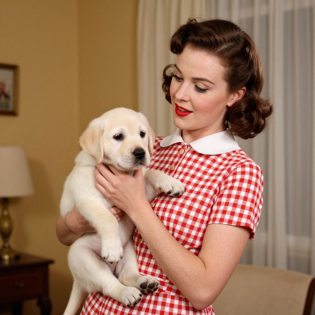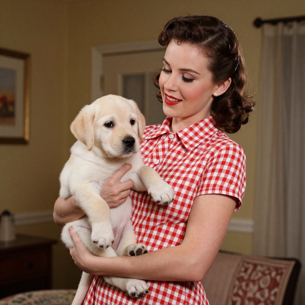 A vintage photograph capturing a retro 1950s aesthetic, featuring a woman in a red-and-white checkered dress holding a light-colored Labrador Retriever puppy, set against a cozy indoor backdrop with warm, nostalgic lighting.