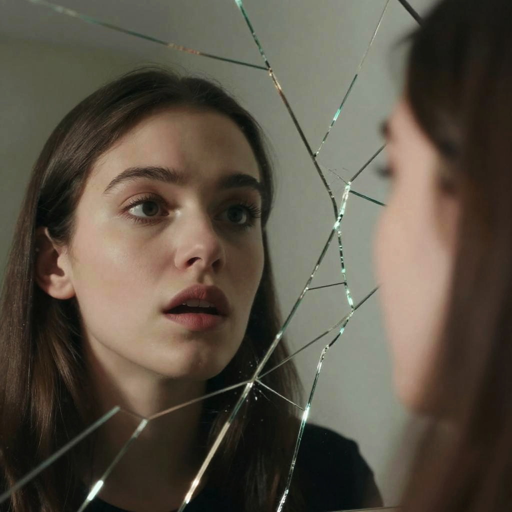 Cracked mirror reflection, close-up of fractured mirror pieces reflecting different emotions on one face, dramatic lighting, cinematic and emotional portrait