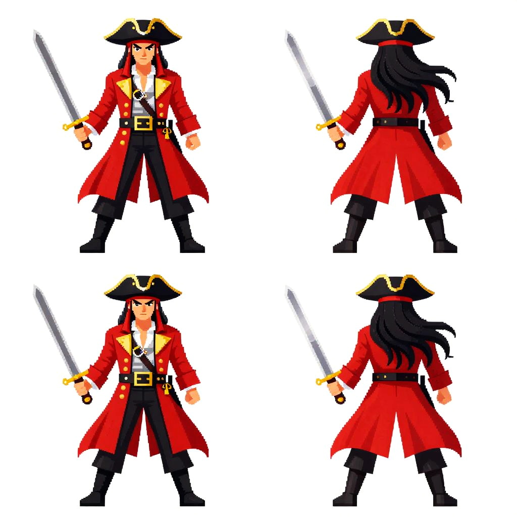 This is a digital illustration of a pirate character in four different poses. The character has long black hair, wears a red coat with gold accents, black pants, and a tricorn hat. He's holding a sword in each image, with the red coat flowing dramatically in some poses. The background is white, making the character stand out. The art style is vivid and slightly pixelated, giving it a retro video game feel.