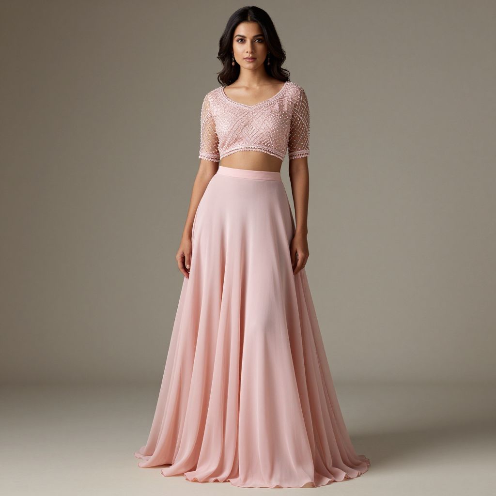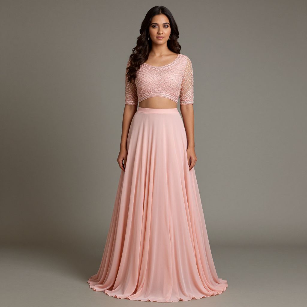 Elegant woman wearing a double-shaded pink Indo-Western gown with intricate beadwork and a flowing chiffon skirt, standing gracefully against a neutral backdrop.