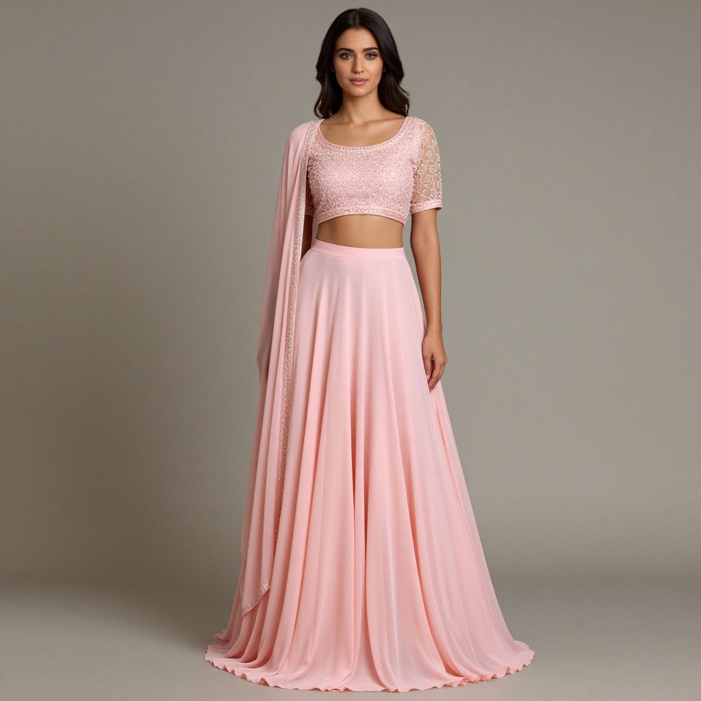 Photograph of a young woman with long, dark hair and medium skin tone, standing against a plain gray background. She wears a light pink, semi-sheer lace crop top with short sleeves and a matching, floor-length, pleated skirt. A pink dupatta (scarf) drapes gracefully over her right shoulder. Her top reveals a small portion of her midriff. She has a calm, neutral expression and stands with her arms relaxed by her sides. The lace on the top is delicate and floral-patterned, while the skirt has a soft, flowing texture. The overall style is elegant and traditional Indian.