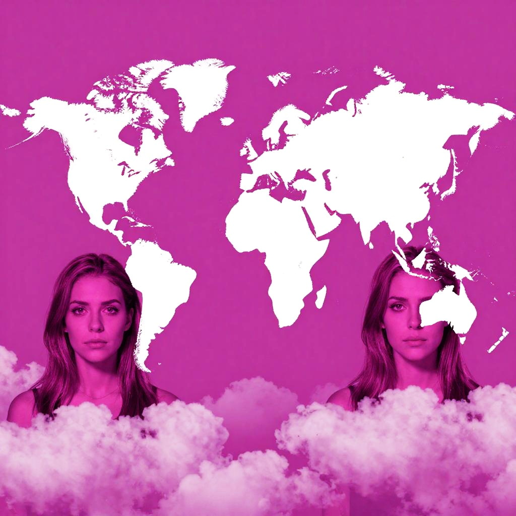 Photo illustration from a world in the clouds, in the style of Alex Garant, vivid magenta and stark white, featuring doubleness in portraits and distorted details, psychedelic hyperrealism