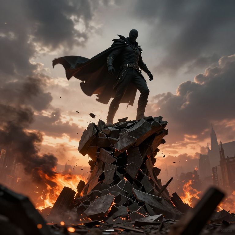 A dramatic digital illustration depicts a silhouetted superhero standing triumphantly on a shattered, rubble-strewn rooftop. The character wears a flowing cape, armored suit with a belt, and boots. The backdrop features a fiery, orange-hued sunset sky with dark, ominous clouds. Debris flies around the superhero, and a distant cityscape with spires is visible on the right. The scene exudes a sense of action and heroism, with the superhero's powerful stance and the chaotic, burning landscape adding to the intensity. The artist uses strong contrasts and dynamic lighting to emphasize the dramatic moment.