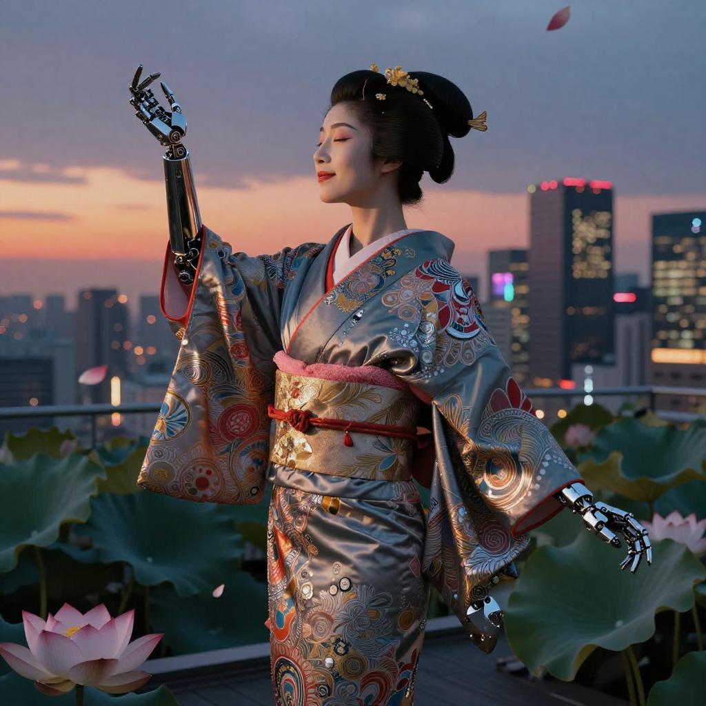 A photorealistic image of a geisha robot with subtle mechanical limbs, dressed in a silk kimono with intricate zentangle patterns and integrated alloy accents. The figure stands gracefully on a rooftop lotus terrace overlooking a neon-lit megacity skyline at dusk. The scene is lit with backlight and chiaroscuro effects, highlighted by floating petals and a vibrant sunset sky, creating a captivating and evocative atmosphere combining traditional and futuristic elements.