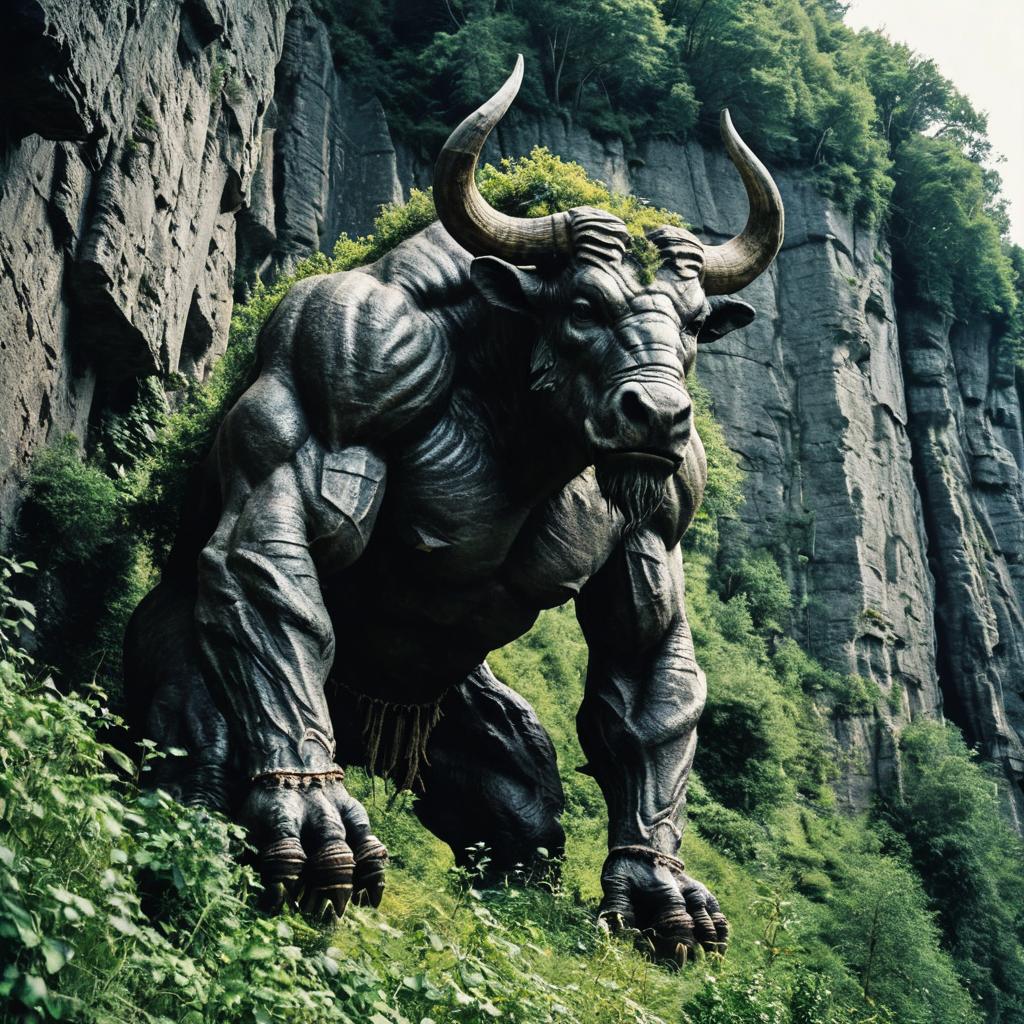 A cliff in the form of a minotaur, overgrown, giant, epic