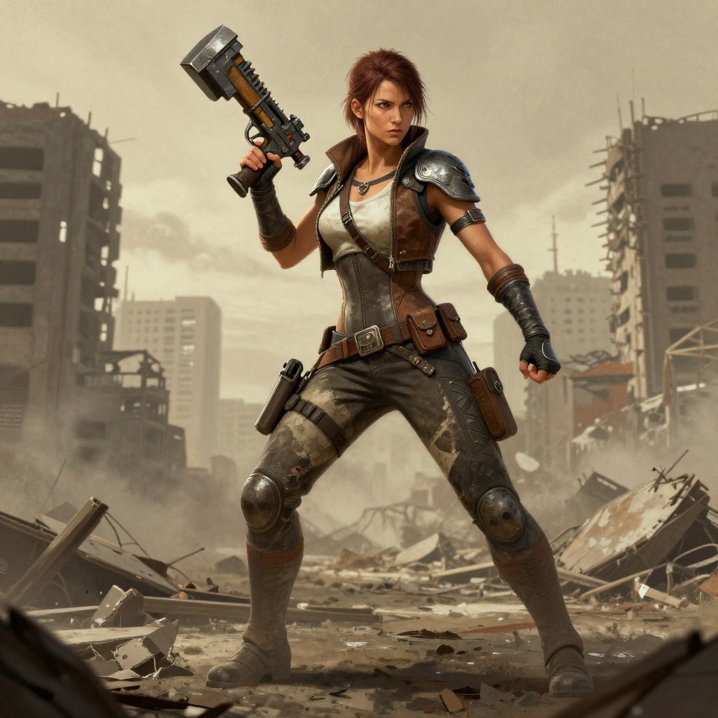 Female fighter art, post-apocalyptic rebel with makeshift weapon, rugged outfit, desolate ruined cityscape, gritty texture, warm color palette, powerful stance, concept art style