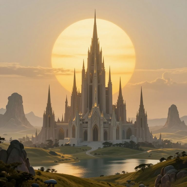 A majestic, otherworldly fortress of towering spires and impossible architecture stands defiantly against a surreal sky, where a massive golden sun looms low, casting an ethereal glow over a tranquil landscape of rolling hills, serene waters, and distant, dreamlike rock formations.
