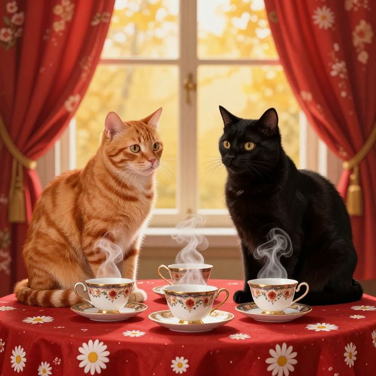 Two cats, one orange tabby and one black, sit gracefully on a red tablecloth adorned with daisies, sharing a cozy tea time with three ornate teacups emitting steam, framed by red curtains with floral patterns and a warm, golden window backdrop.