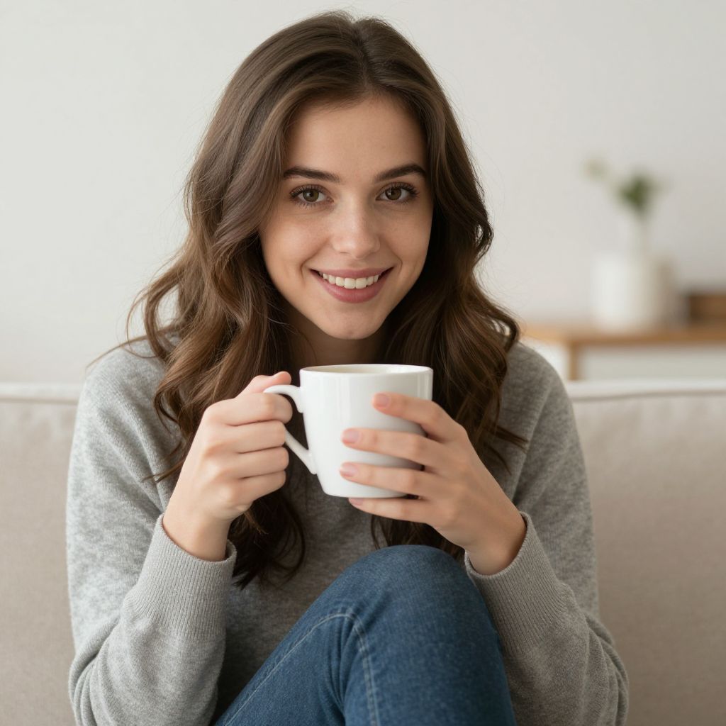 Photograph of a young woman with long, wavy brown hair, fair skin, and brown eyes, smiling warmly while holding a white ceramic mug in both hands. She wears a light gray, long-sleeve sweater and blue jeans, sitting on a white couch. The background is softly blurred, showing a light-colored wall and a wooden table with a small, green potted plant. The overall atmosphere is cozy and inviting, with natural light illuminating the scene.
