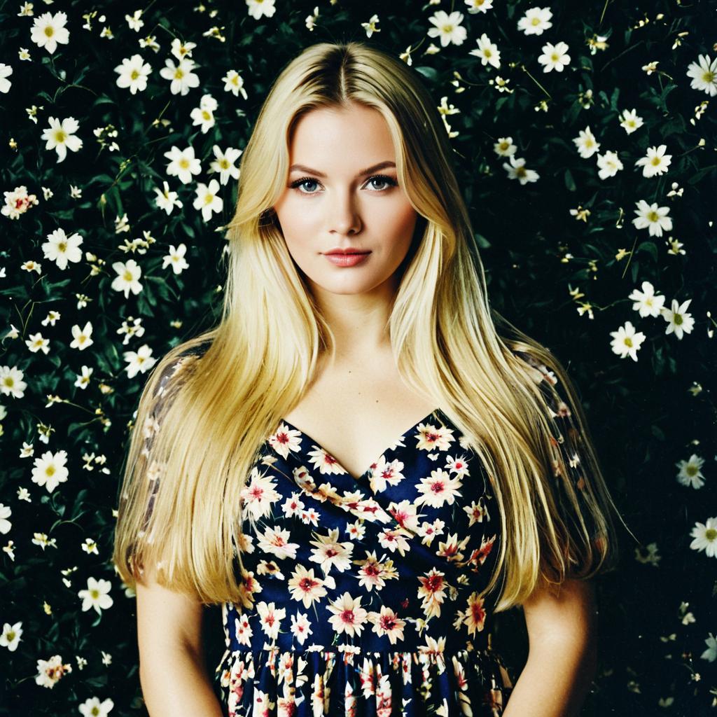 Blonde Woman in Green Tweed Dress with Orange Flower