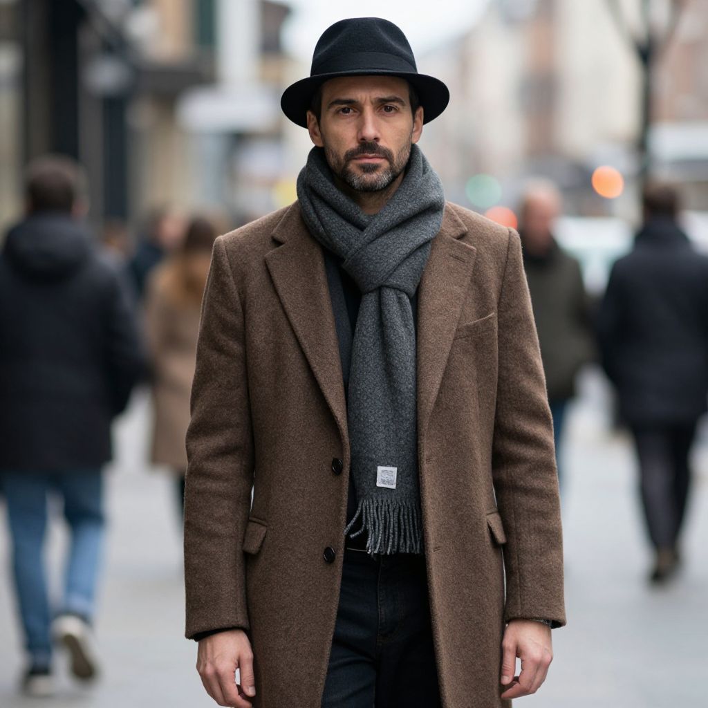"Street Style Man Fashion Costume, man in a hat and scarf standing on the street"