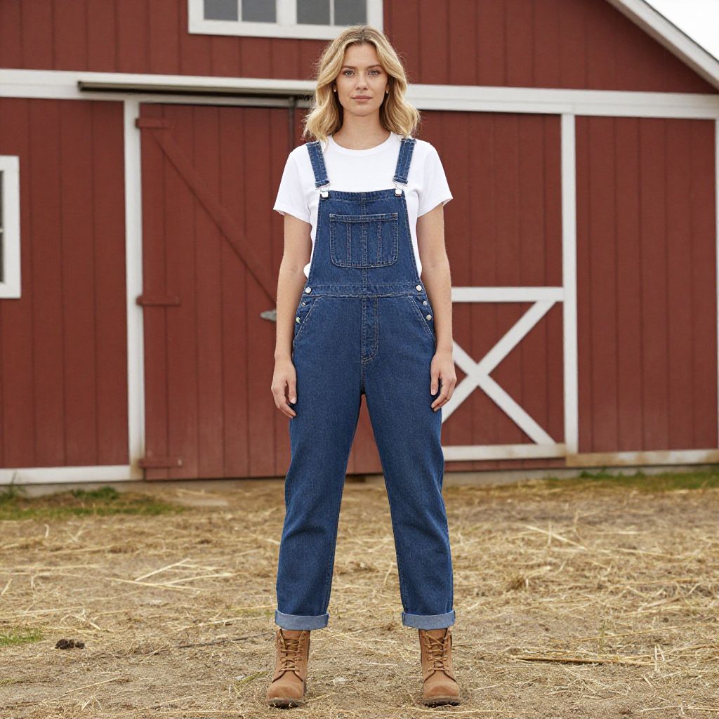 Sustainable Clothing Brands Costume, woman in overalls standing in front of a barn