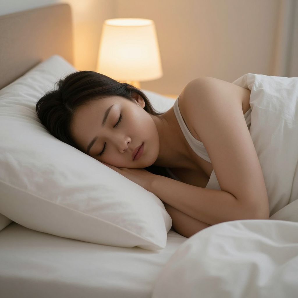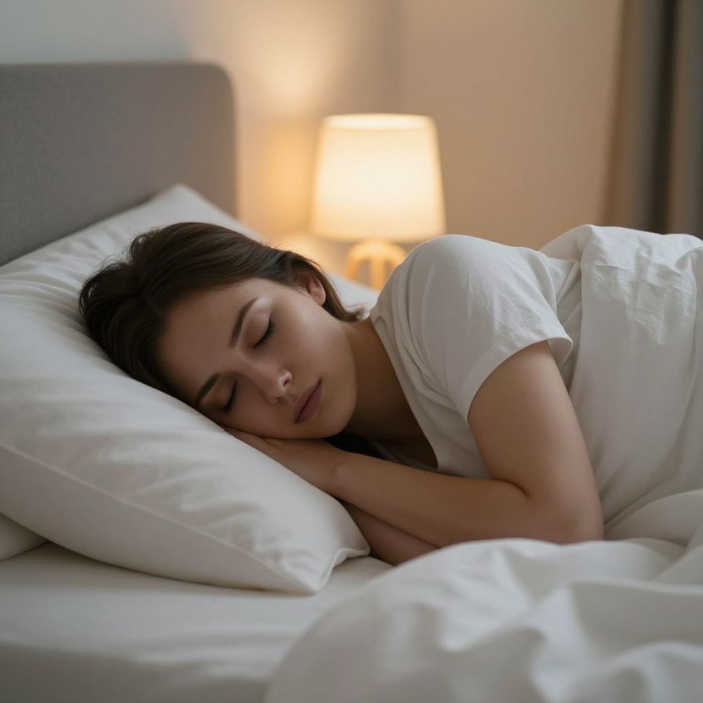 Woman sleeping peacefully in a softly lit bedroom, nestled under crisp white linens with her head resting on a plush pillow, while a warm lamp glows gently in the background.