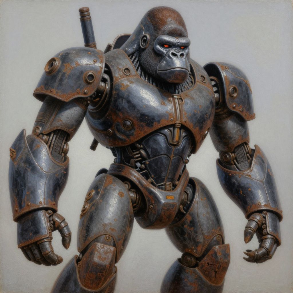 A detailed digital illustration of a robotic gorilla warrior. The robot has a metallic, rusty grey finish with visible bolts and joints, and is designed with a powerful, muscular build. Its face is a realistic gorilla visage with red eyes, giving it a menacing expression. The armor is bulky, with segmented plates on the shoulders, arms, and legs. A small, cylindrical weapon is mounted on its back. The background is a simple, light grey gradient, emphasizing the robot's detailed, textured armor. The style combines realistic anatomy with sci-fi elements, creating a striking, futuristic character.