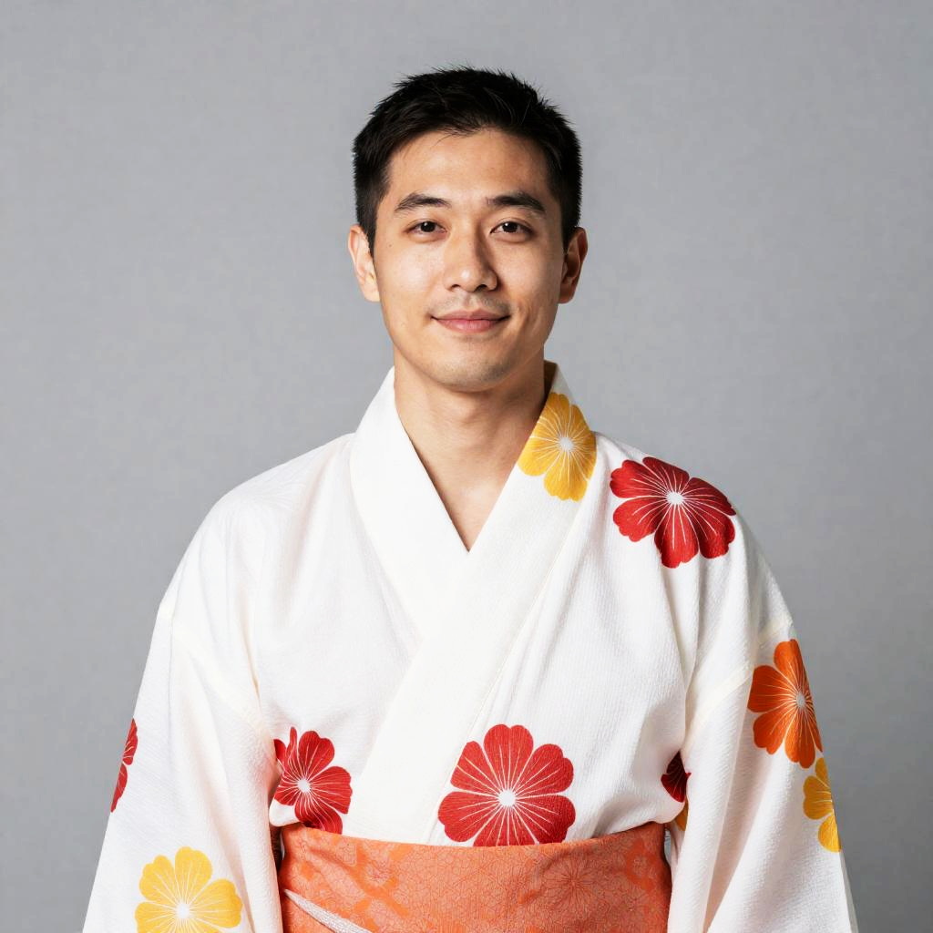 Photograph of a man with short dark hair, light skin, and a slight smile. He wears a white kimono with large red, orange, and yellow floral patterns. Grey background. He stands centered, facing forward.