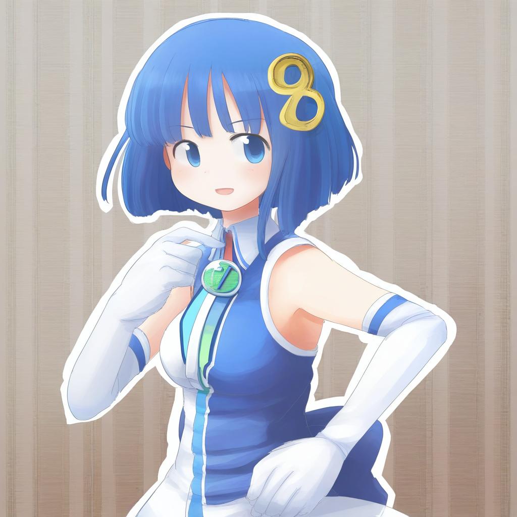 Digital illustration of a young anime-style girl with short blue bob-cut hair and blue eyes. She wears a blue and white outfit featuring a sleeveless top with a green and blue vertical stripe, elbow-length white gloves, and a distinctive yellow hair ornament shaped like the number 8. The image has a soft shading style and a neutral striped background.