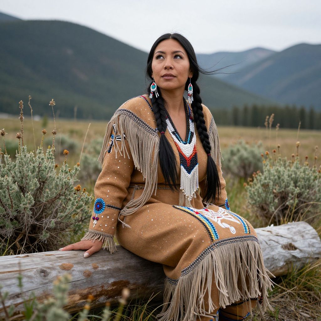 Photograph of a Native American woman with long black hair, wearing a fringed tan dress and intricate jewelry, seated on a log in a mountainous