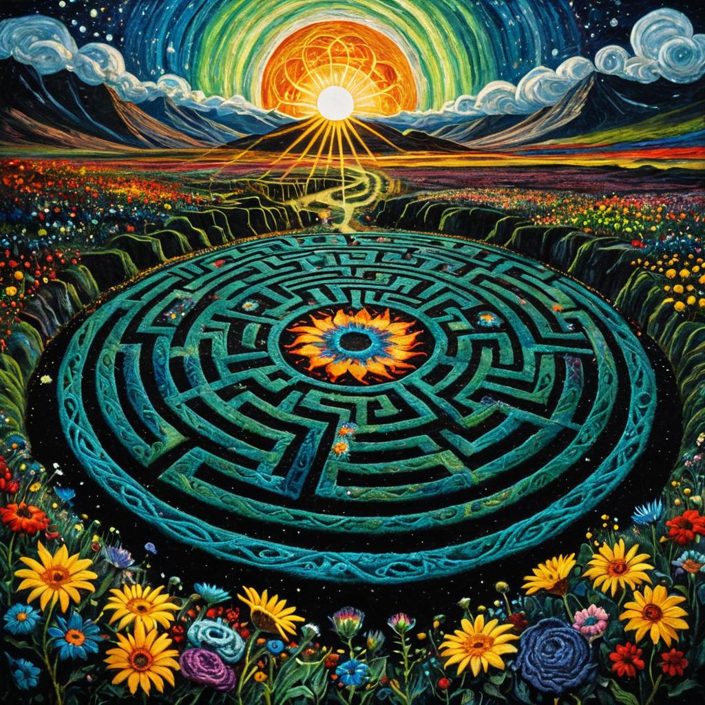 Felted cosmic fractal labyrinth fine-structure, intricate detail, brilliant colors, epic composition, style of Lovis Corinth, flowers competing for the sun, aurora borealis, incandescent