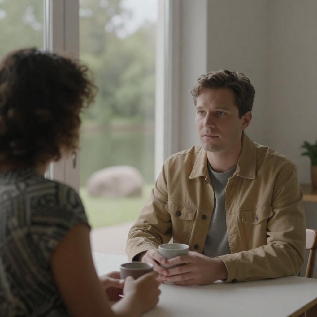 Photograph of two people in a room. Man with short brown hair, tan jacket, and gray shirt sits at a table, holding a mug, looking at the woman. Woman with curly brown hair, patterned top, seen from behind. Large window shows a reflective lake with trees and a rock in the background. Man has a neutral expression, woman's face not visible. Both hands on the table. Light-colored, patterned wall in the background.