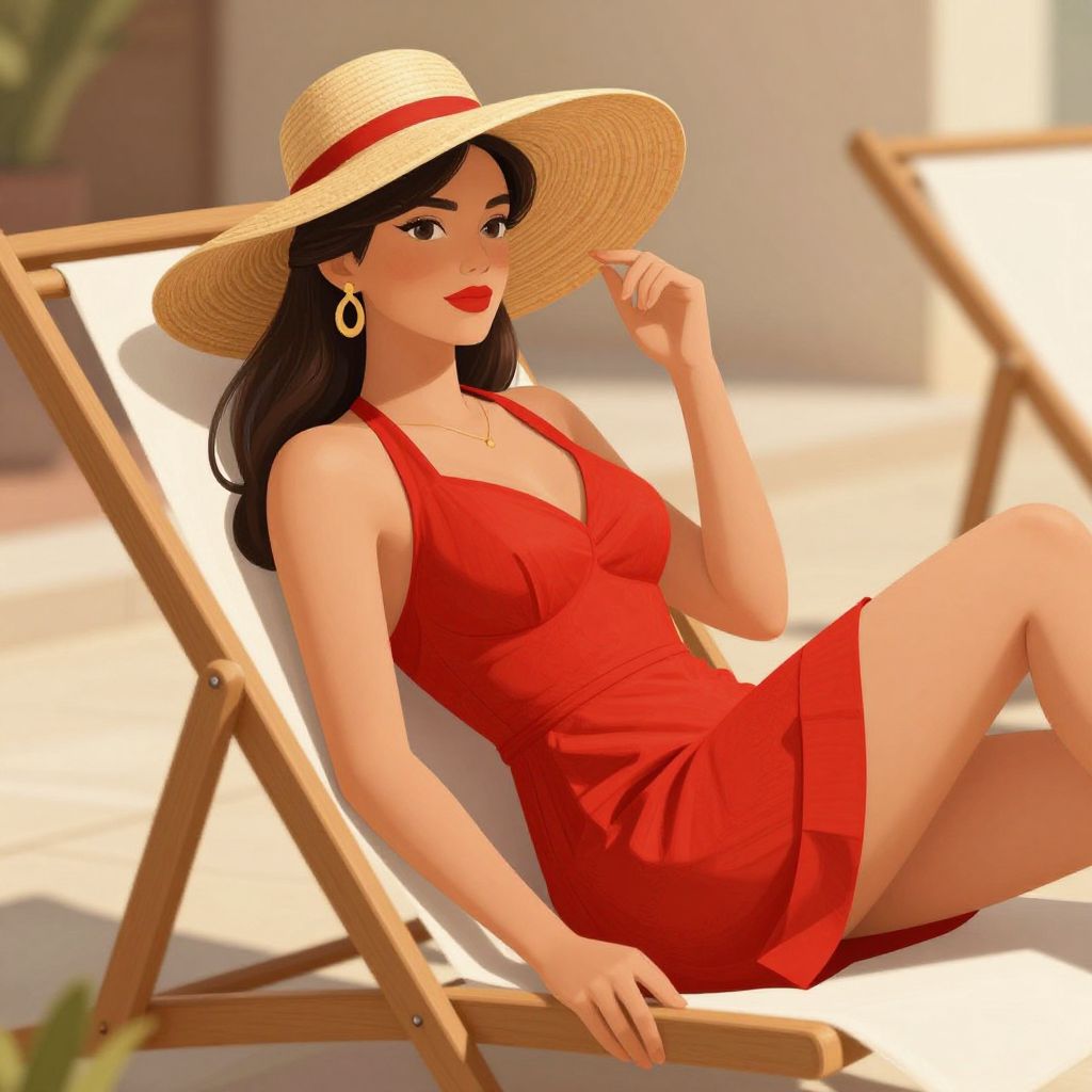 Digital illustration of a beautiful woman with long black hair, fair skin, and red lipstick, lounging in a wooden deck chair. She wears a wide-brimmed straw hat with a red ribbon, large gold hoop earrings, and a red, sleeveless V-neck dress that accentuates her slender figure. Her right hand touches the brim of her hat, and her left arm rests on the chair. The background is sunlit with blurred, beige-colored walls and a hint of greenery. The overall style is vibrant and modern, capturing a relaxed, summery vibe.