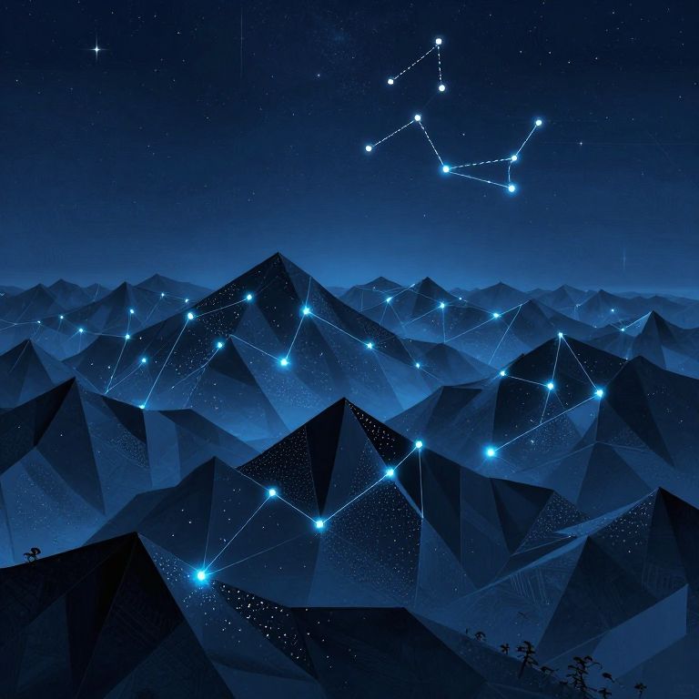 Digital artwork of a starry night sky over a mountain range, with glowing blue constellation lines connecting bright stars across the dark, jagged peaks.