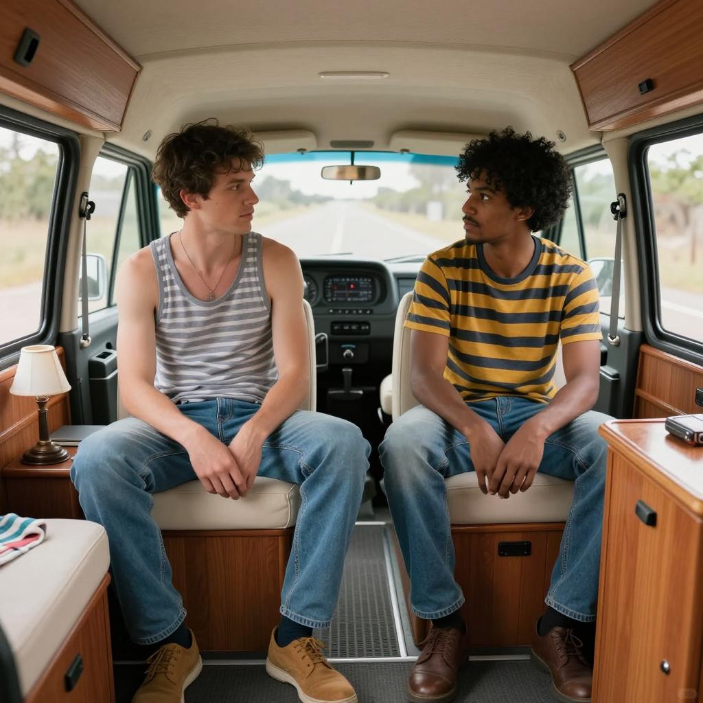 Man in beige hat and light shirt driving vintage car, viewed from behind, holding steering wheel. Dark wooden dashboard with chrome accents. Front windshield shows white and black vintage car on coastal road, two people standing, mountains in background. Reflection in rearview mirror. Bright daylight, clear sky.