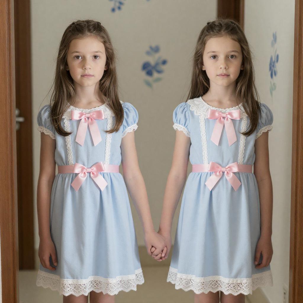 Photograph of two identical young girls with fair skin and long brown hair, wearing light blue dresses with white lace trim and pink bows, standing side by side in a floral-patterned hallway. Both have neutral expressions, holding hands. Background features light-colored walls with blue floral patterns and a wooden door frame.