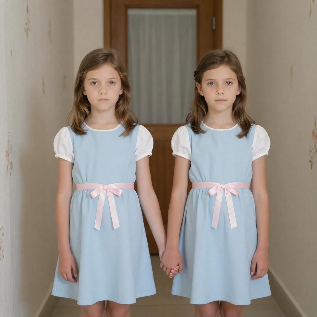 Identical Twins in Floral Hallway