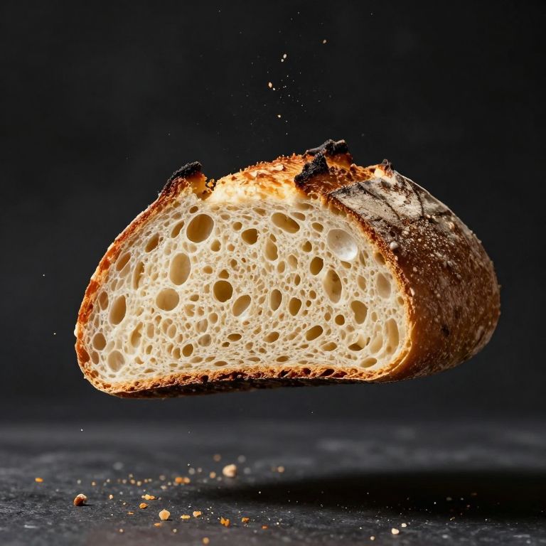 Loaf of artisan bread, sliced open to reveal its golden crumb, hovers serenely against a dark backdrop, surrounded by a scattering of airborne crumbs that dance around it like celestial particles.
