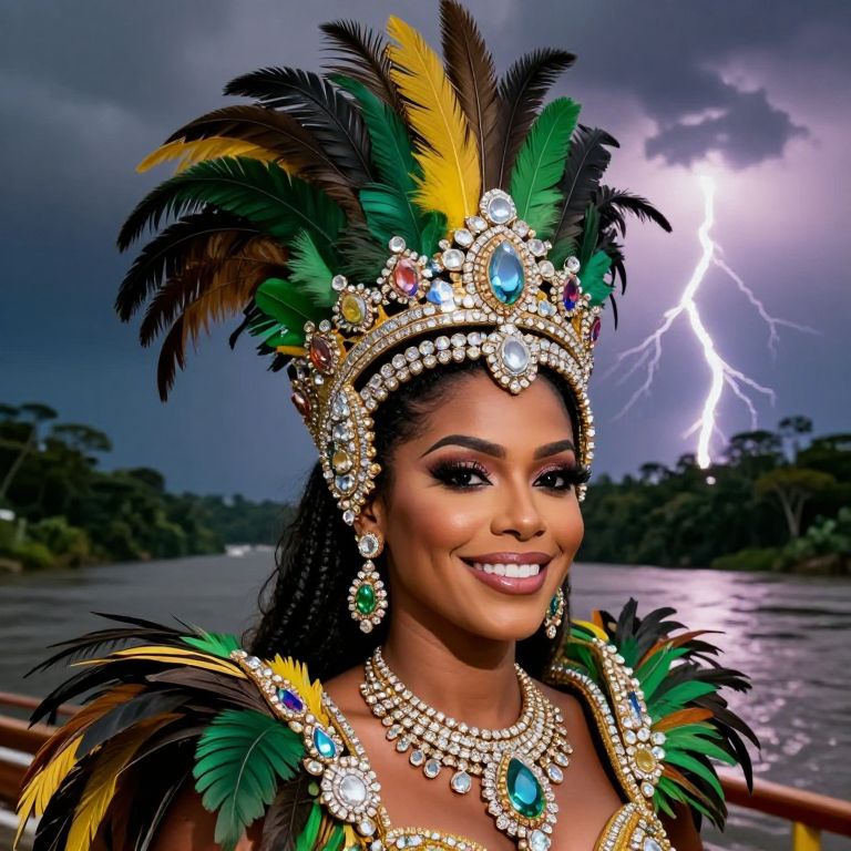 A dramatic portrait of a Brazilian queen in a royal ceremony, wearing a crown of living tropical feathers and embedded rhinestones that catch the light, her face sharp and radiant, with expressive eyes and a bold smirk, standing in front of a backdrop of a Brazilian Amazonian river under a stormy sky with lightning flashes.