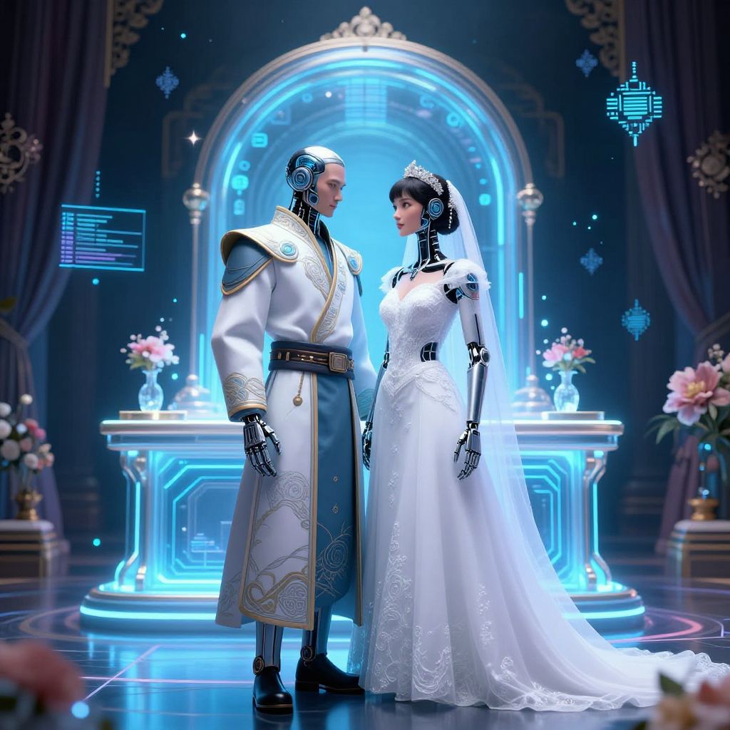 AI wedding portrait of a cybernetic couple dressed in a fusion of traditional and sci-fi inspired outfits, standing in front of glowing digital altar, surrounded by virtual reality effects and pixelated floral patterns, conveying love and connection in an advanced digital world.