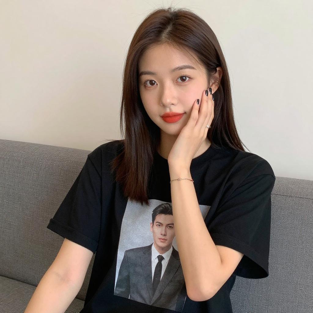 Photograph of an Asian woman with fair skin and straight, dark brown hair, wearing a black t-shirt with a printed image of a man in a suit. She has red lipstick, black nail polish, and a bracelet on her right wrist. She is sitting on a gray couch, with her left hand touching her cheek and a slight smile on her face.