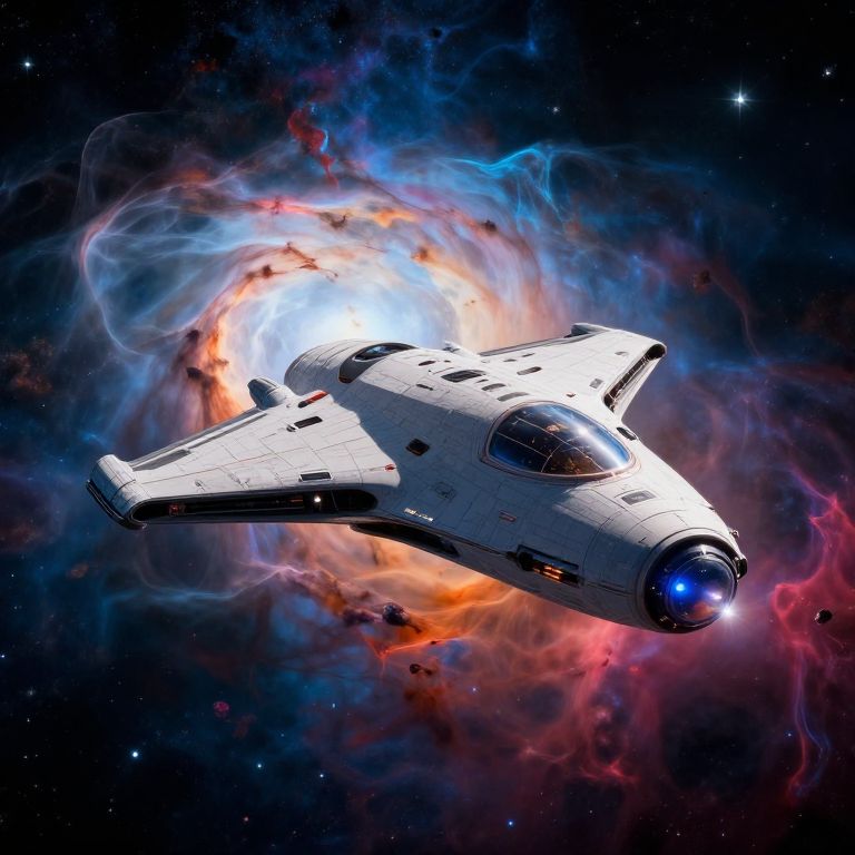 Starship prompt depicting a sleek futuristic spacecraft soaring through a vibrant cosmic nebula, illuminated by distant stars and swirling colorful gases, intricate details on the hull, dynamic lighting and a sense of vast interstellar adventure.