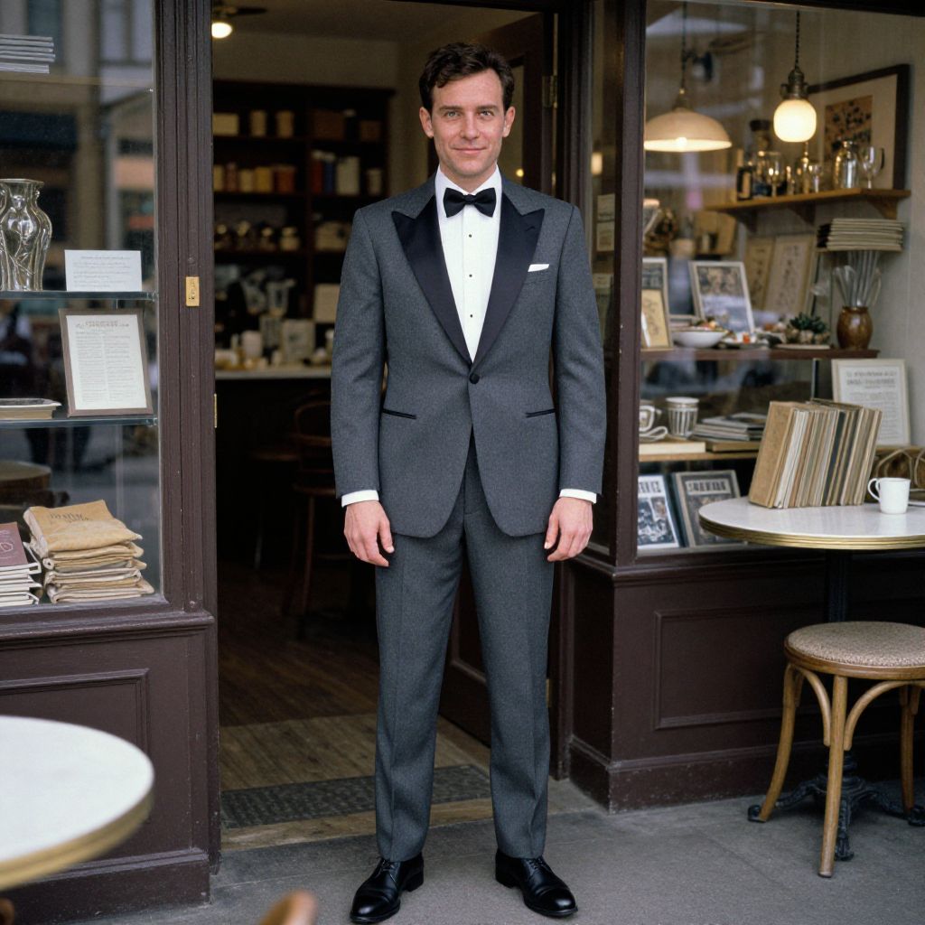 A man, charcoal gray tuxedo, satin shawl collar, white dress shirt, black silk bow tie, fitted gray trousers, matte black derby shoes, vintage architecture, cozy cafes, artisanal shops, ektachrome film stock, confident expression, soft smile. Man has masculine face and piercing eyes