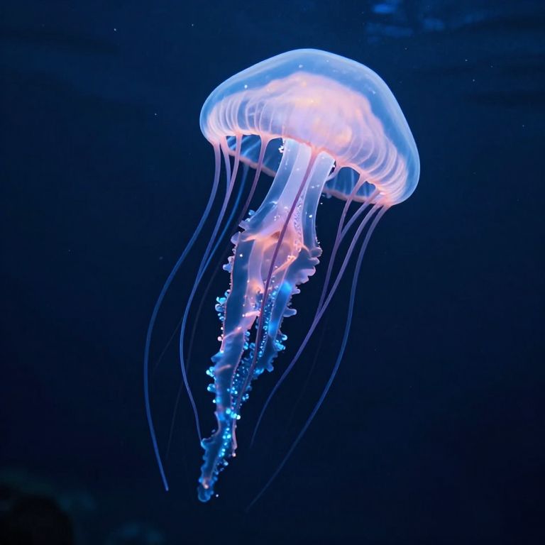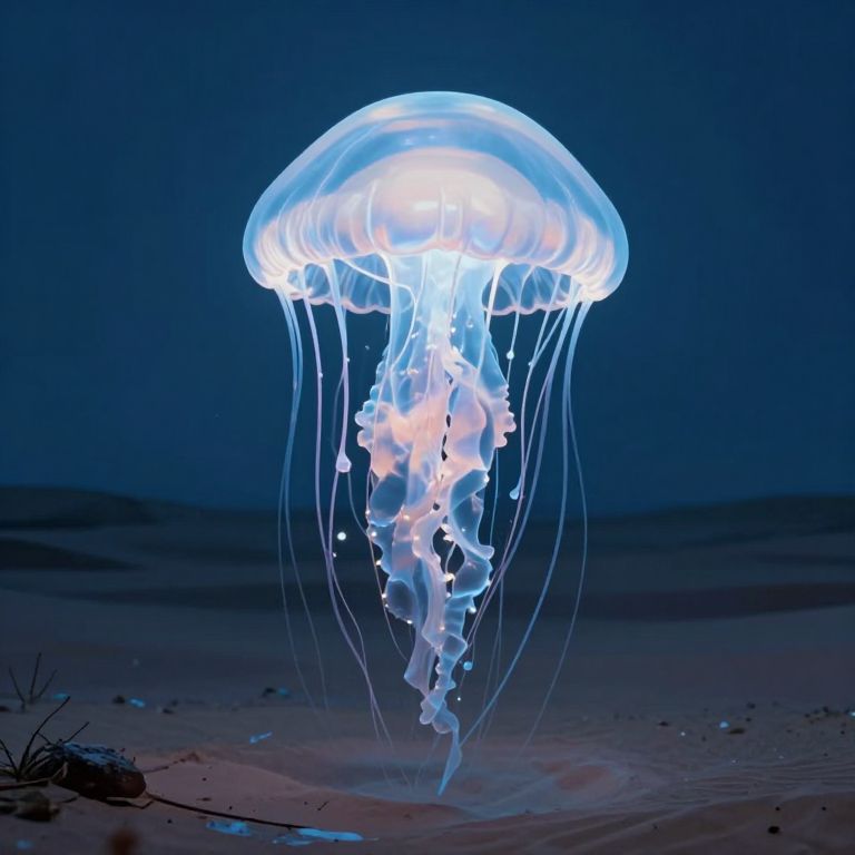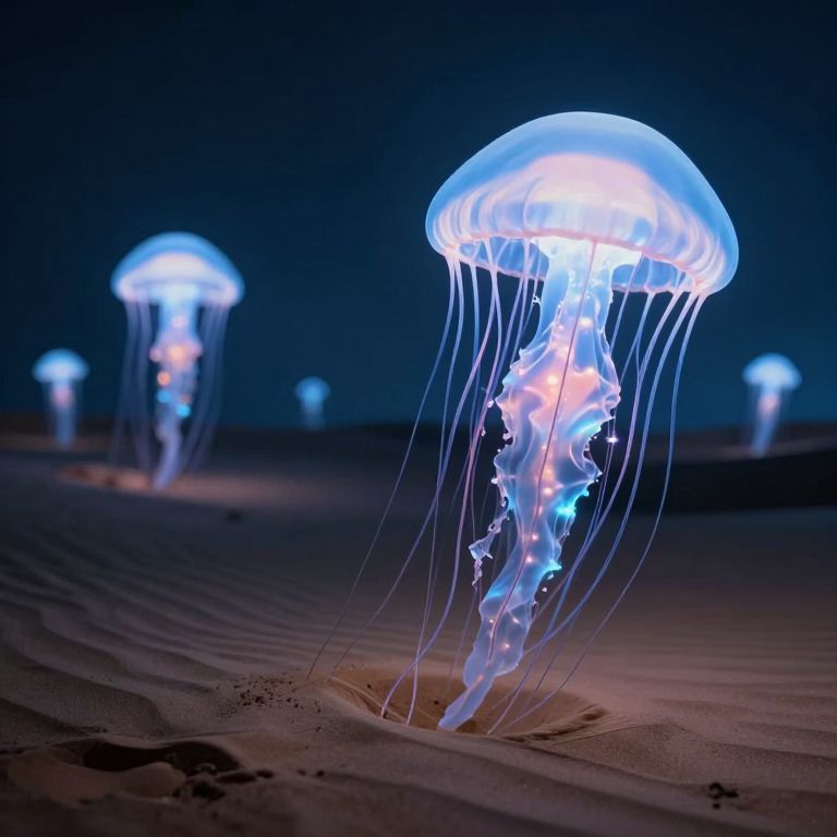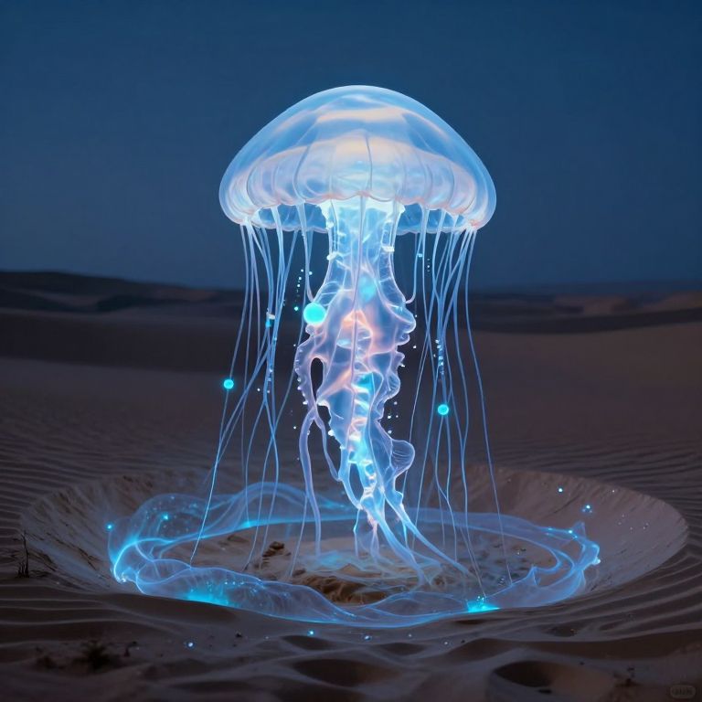 Giant jellyfish drift silently through a desert, their pulsing bell bodies holding oceans of glowing sand.