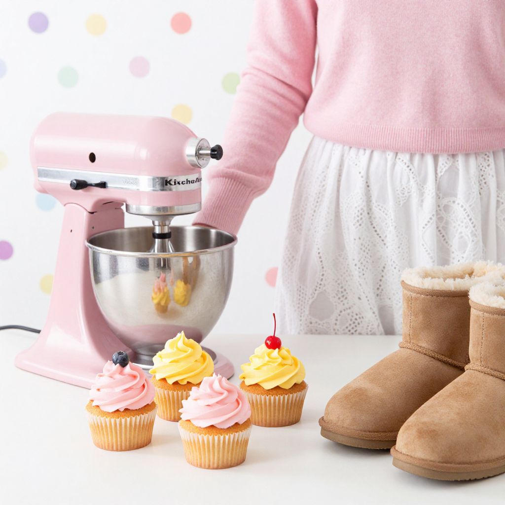 Cupcakes adorned with pink and yellow frosting sit atop a white surface, accompanied by a pink KitchenAid stand mixer, a woman wearing a pink sweater and a white lace dress, and a pair of tan UGG Australia boots, all set against a backdrop of soft pastel polka dots.